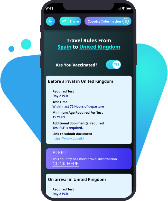 Travel rules are constantly changing from country to country to keep people safe from COVID-19. Our team have been at the forefront of the pandemic since February 2020 and have pioneered innovative technologies to help reduce the spread of the virus. The travel industry has suffered immensely and with lack of information and continuous travel restrictions, View the travel information for any destination with minimum effort.